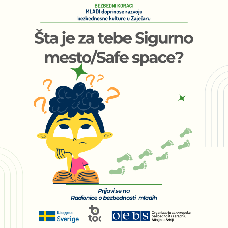 Radionice Sigurno mesto deo su projekta “Bezbedni koraci – MLADI doprinose razvoju bezbednosne kulture u Zaječaru”, koji TOC realizuje uz podršku Misije OEBS-a u Srbiji i Vlade Švedske u okviru šireg projekta „Konsolidovanje procesa demokratizacije u sektoru bezbednosti u Republici Srbiji“.
